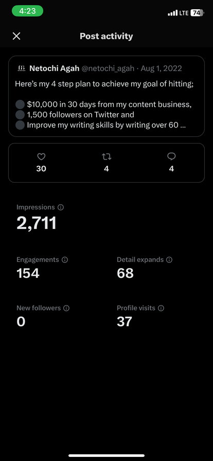 With a new account we aimed to get to 1,000 followers and 300 email subscribers in the first 30 days of consistently showing up writing 5 Tweets daily and 1-3 Threads weekly.